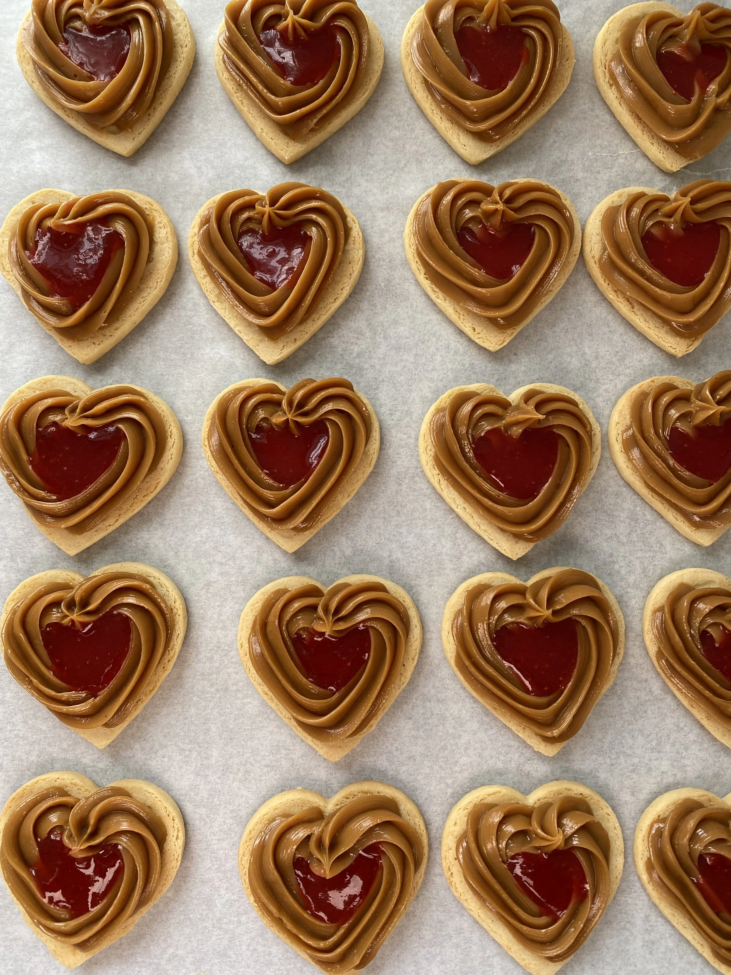 Two Heart Shaped Melt-in-Your-Mouth Shortbread Cookies With Dulce de Leche Caramel and fresh Strawberry Jam in the Middle.